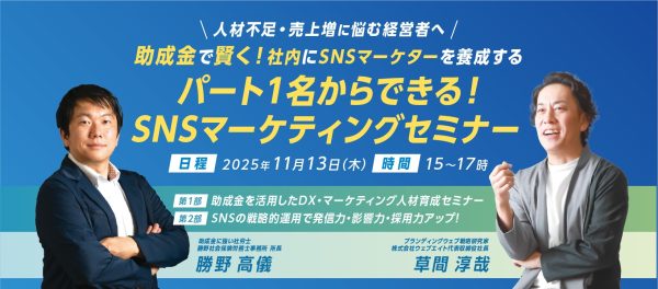 本セミナーでは、助成金を活用しながら、パート1名からでも社内にSNSマーケターを育成できる方法をお伝えします。経営環境の変化や最新データをふまえ、助成金制度の活用ポイント、そしてSNS運用を担う人材の役割や可能性を具体的に解説。
