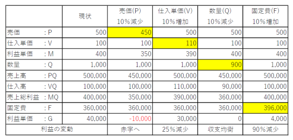 この例からもわかる通り、同じ“10%の変化”でも、どの要素が変動するかによって利益への影響は大きく異なることがわかります。
