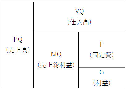 これを用いると売上高はPQ(売価×数量)、仕入高はVQ(仕入単価×数量)、売上総利益はMQ(利益単価×数量)と表すことができます。